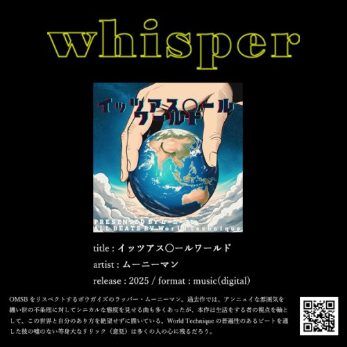 OMSB をリスペクトするボウガイズのラッパー・ムーニーマン。過去作では、アンニュイな雰囲気を纏い世の不条理に対してシニカルな態度を見せる曲も多くあったが、本作は生活をする者の視点を軸として、この世界と自分のあり方を絶望せずに描いている。World Technique の普遍性のあるビートを通した彼の嘘のない等身大なリリック(意見)は多くの人の心に残るだろう。