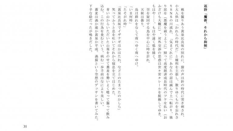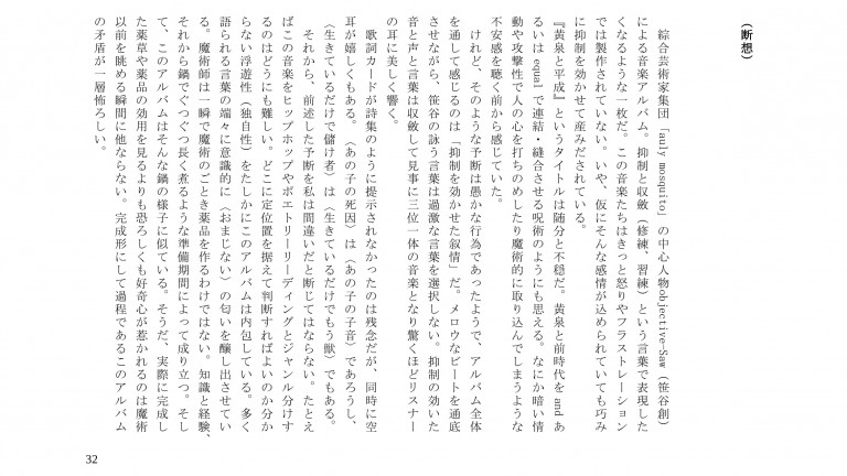 objective-Saw のアルバム『黄泉と平成』を聴いて書いた詩とレビュー。詩はもの自体の見えない側面を映し出すという点において一種の批評装置である。つまり返詩とはレビューである。レビューは不可思議な写し鏡のように、人の目を通した作品自体を刺激的に集約し要約する。何百語・何十分の一枚のアルバムを僅かな言葉で形づくる。その意味でレビューとは正に詩作行為に近づく。